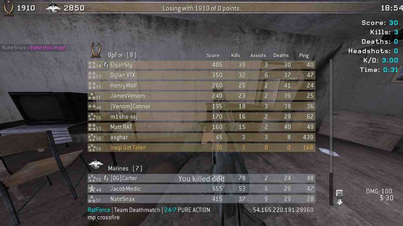 | asghar | RatForce | Team Deathmatch | 24/7 PURE ACTION | 2025-10-18 15:41:44 | 8406 | Report | |