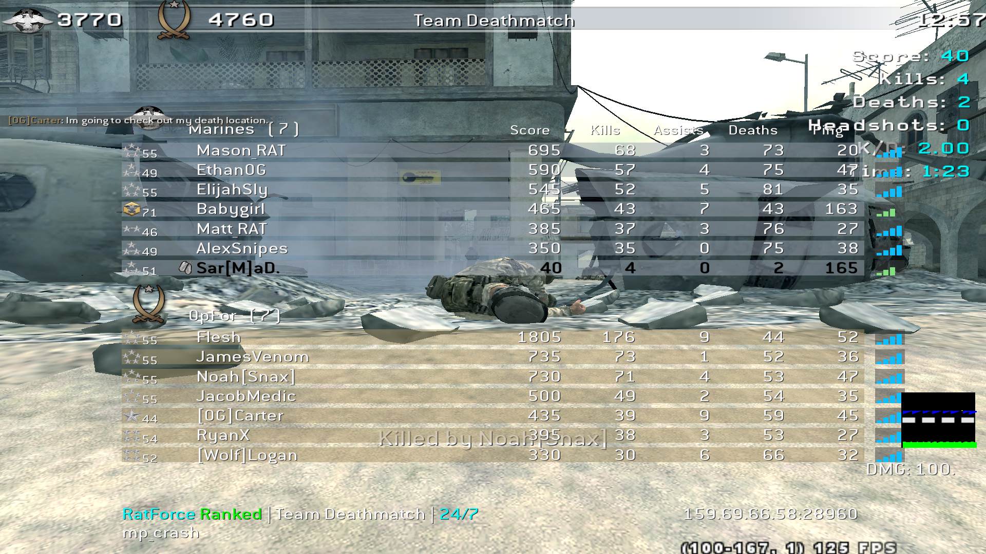 | Sar[M]aD. | RatForce Ranked | Team Deathmatch | 24/7 | 2025-08-19 14:08:20 | 3309 | Report | |