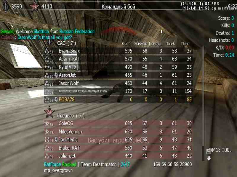| BOBA78 | RatForce Ranked | Team Deathmatch | 24/7 | 2025-08-17 09:41:17 | 5102 | Report | |