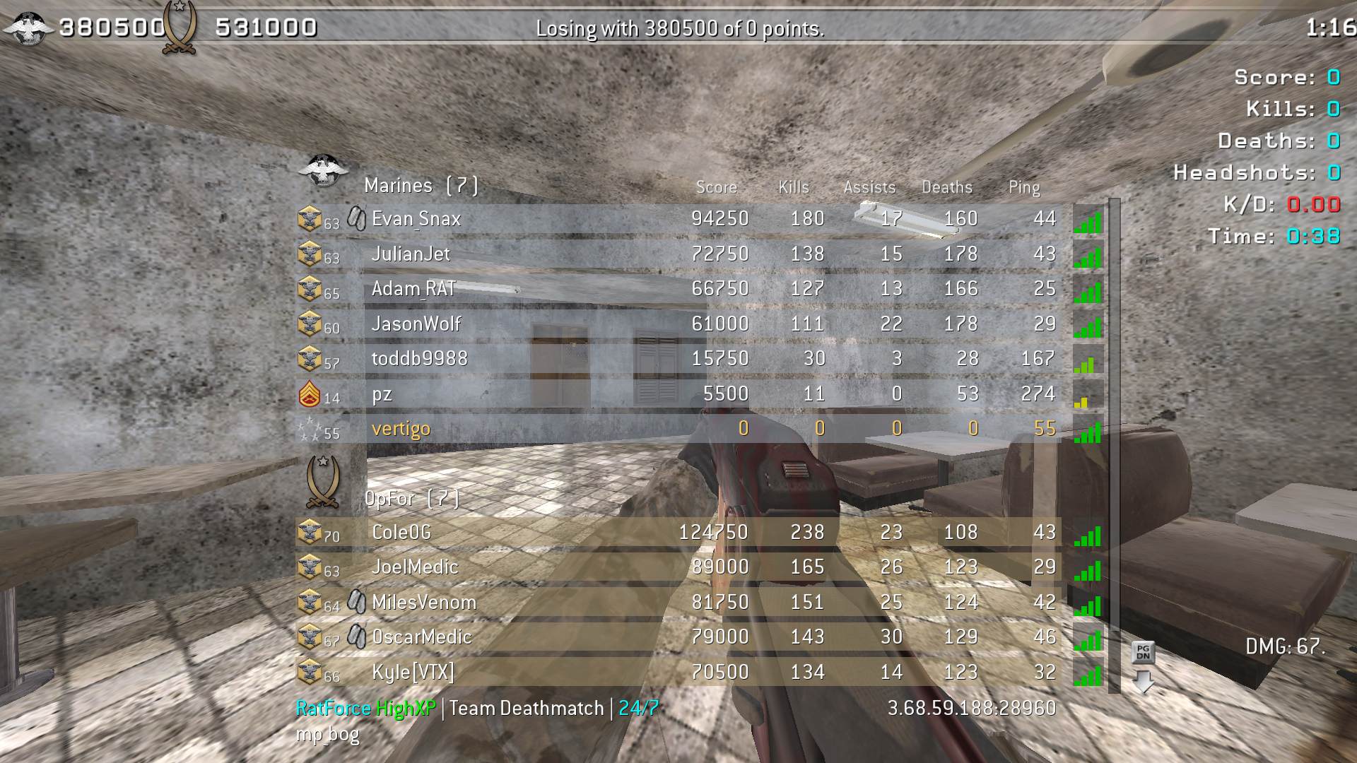 | ReNnEss_55 | RatForce HighXP | Team Deathmatch | 24/7 | 2025-07-01 16:47:55 | 9676 | Report | |